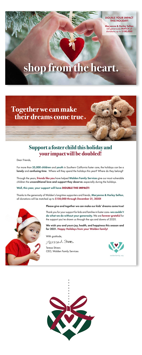 The campaign was promoted via multiple channels: a printed postcard; a direct mail plea; digital advertising; multiple e-blasts; and heavy social media postings on the org's Facebook, Instagram, Twitter, and LinkedIn channels. Donations were tracked with a goal meter that was used to motivate supporters to make contributions to help the organization reach its $150,000 match. The print and digital combination proved a success. The Shop from the Heart campaign match was met—and exceeded—nearly three weeks before its deadline.